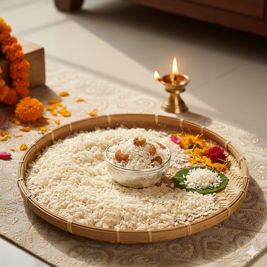 Chura is flattened rice made from paddy, traditionally used in Indian rituals and cuisine as a symbol of nourishment and prosperity.