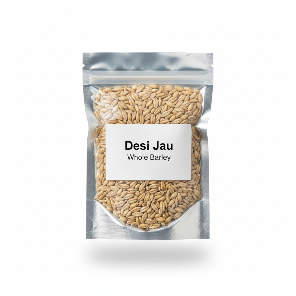 Desi Jau (Indian Barley) is a sacred grain included in the Hawan Samagri as a symbolic offering to the fire, representing prosperity, fertility, and the fulfillment of worldly desires presented to the deities.