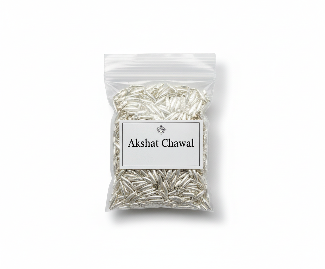 Clean, unbroken, and generally mixed with turmeric and Kumkum , Akshat Chawal (sacred rice) is one of the most fundamental offerings in any Hindu ritual. It symbolizes prosperity, fertility, and is offered to invoke the blessings of the deities.