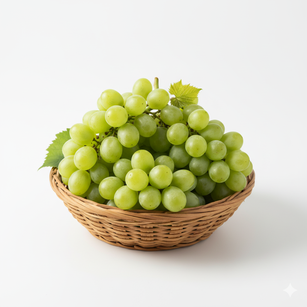 A pack of sweet, juicy grapes, a highly refreshing seasonal fruit, often used to decorate fruit baskets and as a light Prasad.