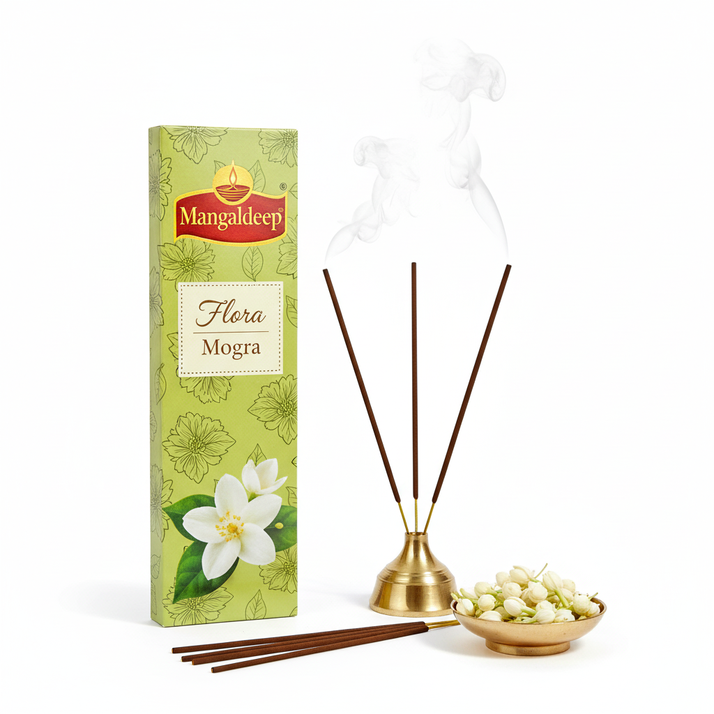 Mangaldeep Flora Mogra Incense Sticks: Elevate your prayers with the soothing, pure fragrance of Mogra (Jasmine), inviting peace and divine tranquility into your sacred space