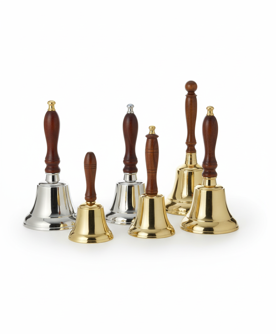 These beautiful brass hand bells produce a clear, resonant sound believed to invite divine presence and ward off negative energy. A timeless ritual accessory, its bright chime is perfect for signaling the beginning and end of prayers.