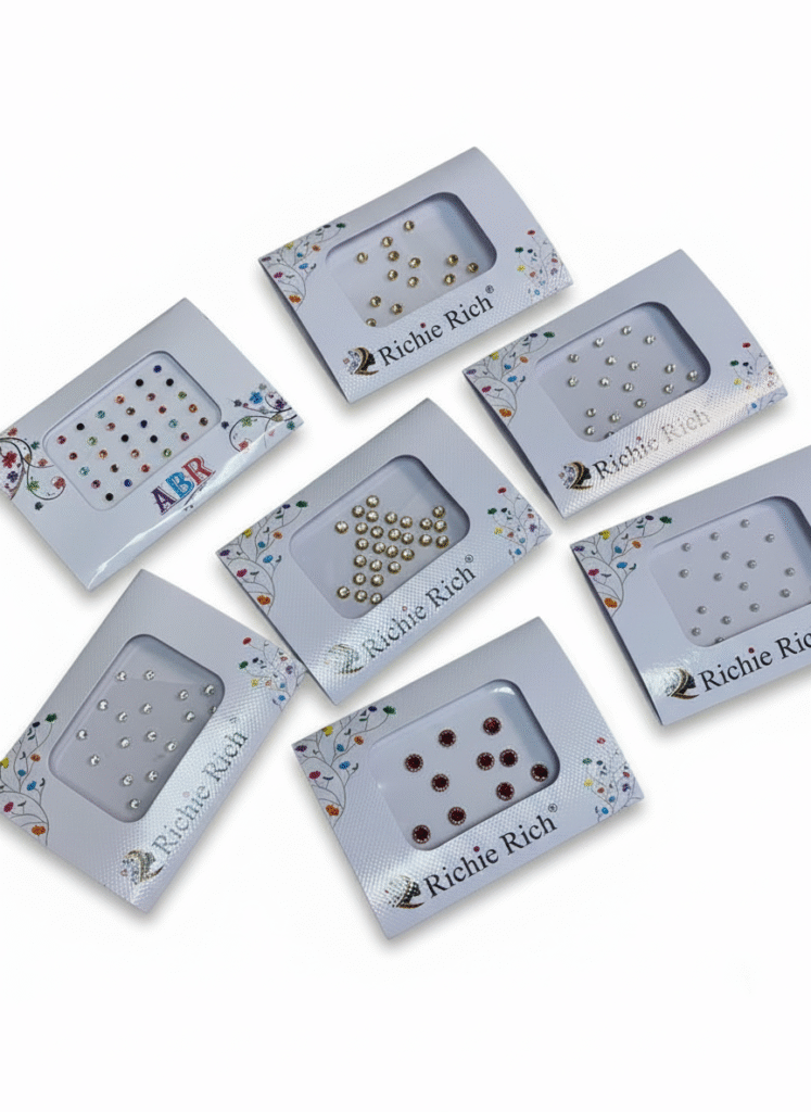 A collection of decorative bindis, traditionally worn by women on the forehead to signify the ajna chakra (third eye). These are offered in various colors and designs to complement your devotional attire.